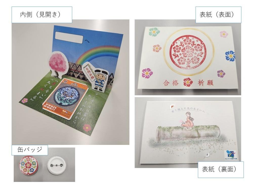 丸い形状のマンホールのふたは、その構造から落ちることがありません!また物事が「丸く収まる」ともいわれています。もうすぐ受験シーズンを控え、この縁起がよい「マンホールのふた」をカードにした本市のマンホールカードをお守りとして持ち歩いてもらえるよう台紙を用意しました!(さらに本市はマンホールカード台紙に宛名の記入ができるものも用意しました!)