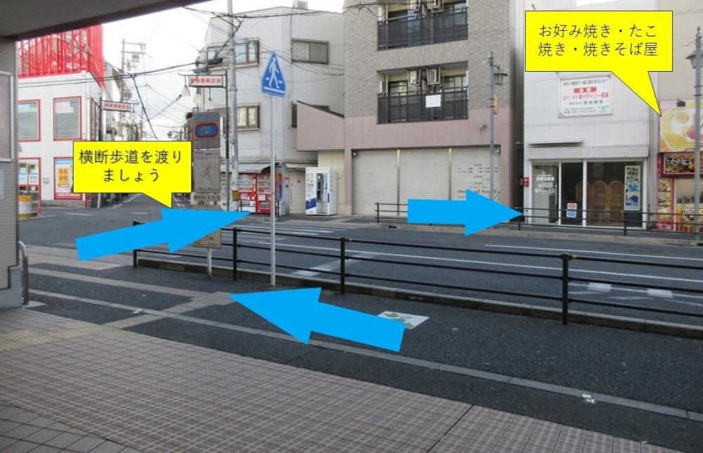 近鉄長瀬駅の西側改札です。八尾方面からお越しの方はこちらに出ます。地下通路や踏切を渡った方もこちらに出ます。横断歩道を渡って右へ進んでください。