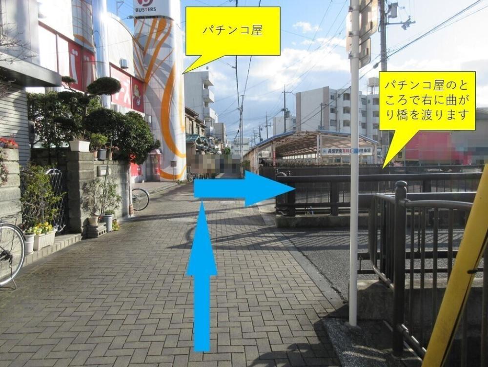 パチンコ屋を右に曲がった後は、橋を渡って真っすぐ進んでください。