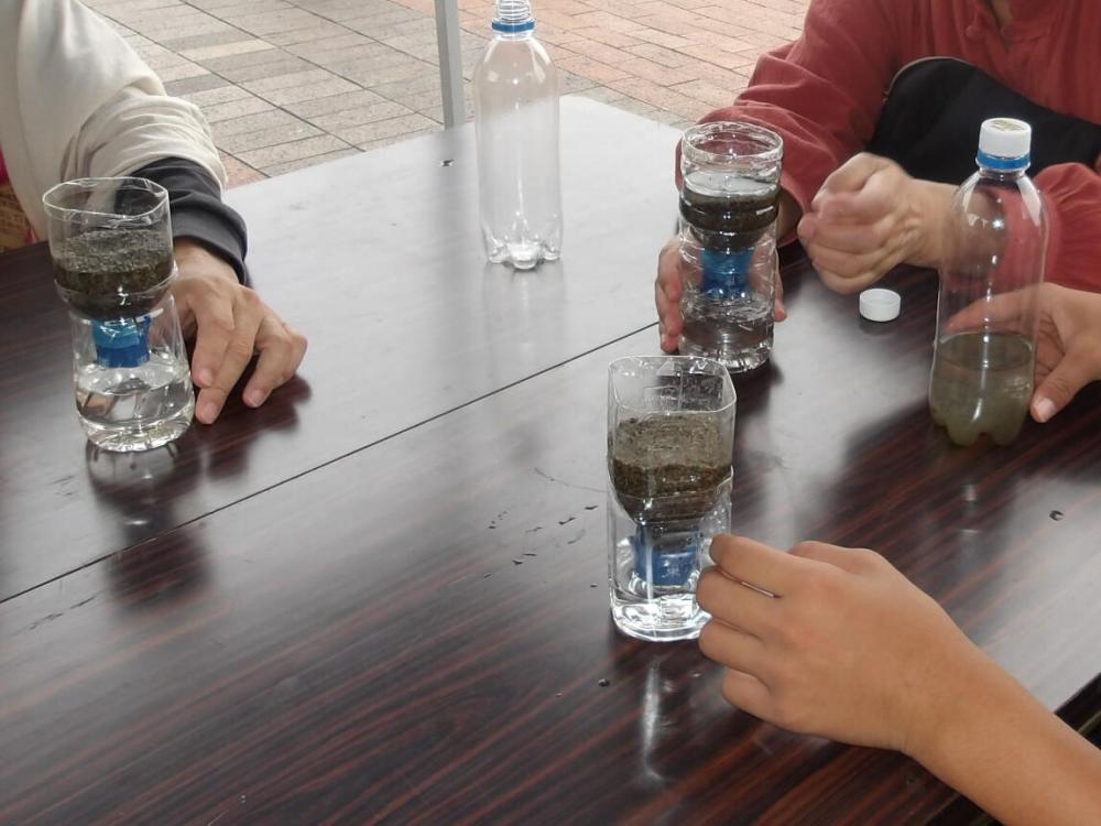 また、体験スペースではペットボトルを再利用した器具を用いて「水のろ過実験」を行いました。