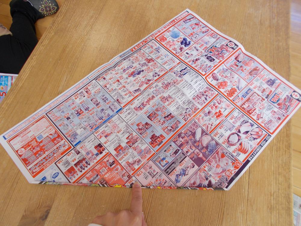 1.大きい広告紙、小さい広告紙を丸めて、細いくるくる棒を5本作ります。(長いくるくる棒4本、短いくるくる棒1本が出来上がります)