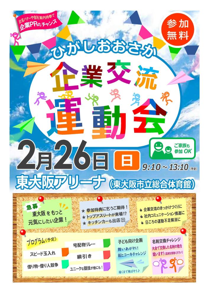 令和5年2月26日に開催された「ひがしおおさか企業交流運動会」の情報発信をイオン株式会社(イオン鴻池店・イオン布施店)、大阪シティ信用金庫、第一生命保険株式会社、明治安田生命保険相互会社の4社にご協力いただきました。また、株式会社ノーサイド、第一生命保険株式会社、井藤漢方製薬株式会社はイベントにもご参加いただきました。