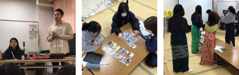 野中さんが制作したミャンマーに関するクイズ大会、ヤンゴンかるた大会を通じてミャンマー、ヤンゴンの歴史や文化について学びました。また、ロンジー(民族衣装)体験では、児童生徒が色とりどりの布に素敵な刺繍が施されたロンジーを試着しました。